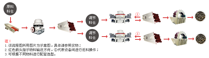 工藝流程須知:當物料小于40mm時,直接進入制砂機破碎,不用前面的第一段破碎。