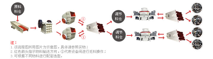 工藝流程須知:當(dāng)物料小于40mm時,直接進(jìn)入制砂機破碎,不用前面的第一段破碎和第二段破碎。