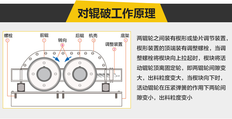 配置了防塵及消音裝置, 有效實現(xiàn)了低粉塵、低噪音的理想生產(chǎn)狀態(tài)。輥式破碎機是利用輥面的摩擦力將物料咬入破碎區(qū),使之承受擠壓或劈裂而破碎的機械。當(dāng)用于粗碎或需要增大破碎比時,常在輥面上做出牙齒或溝槽以增大劈裂作用。