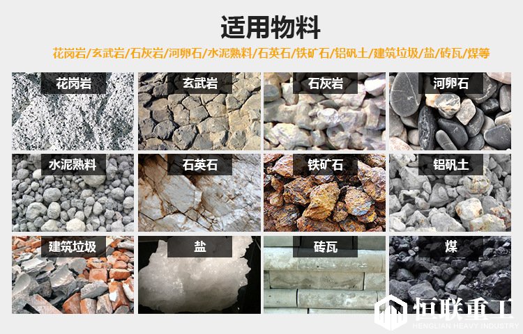 【適用物料】:花崗巖、玄武巖、石灰?guī)r、河卵石、水泥熟料、石英石、鐵礦石、鋁礬土、建筑垃圾、鹽、磚瓦、煤等。