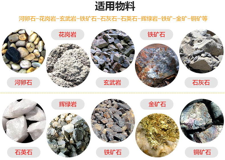 【適用物料】:河卵石、花崗巖、玄武巖、鐵礦石、石灰石、石英石、輝綠巖、鐵礦、金礦、銅礦等。
