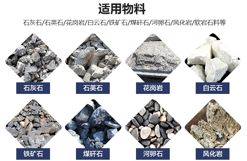 【適用物料】:石灰石、石英石、花崗巖、白云石、鐵礦石、煤矸石、河卵石、風(fēng)化巖、軟巖石料等。