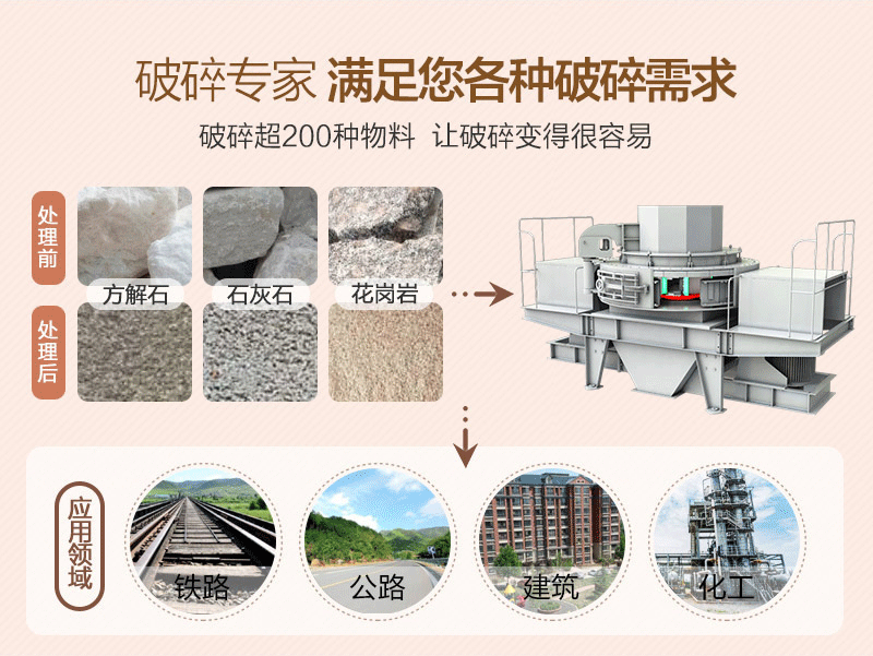 【應用范圍】:工程領域的水利水電、高速公路、橋梁、市政工程、高層建筑的機制砂生產和石料整形。礦業(yè)領域的磨礦前段細碎工藝,玻璃、石英砂和其他高純度材料的生產。