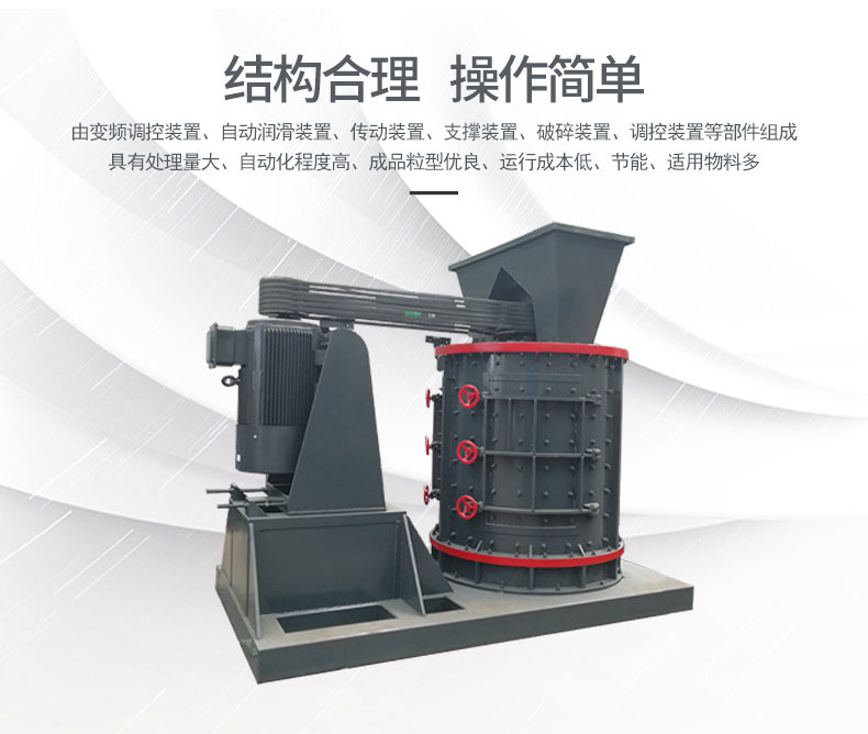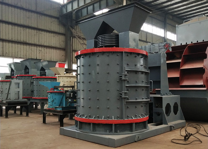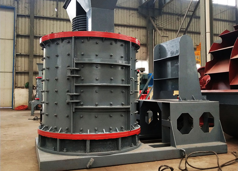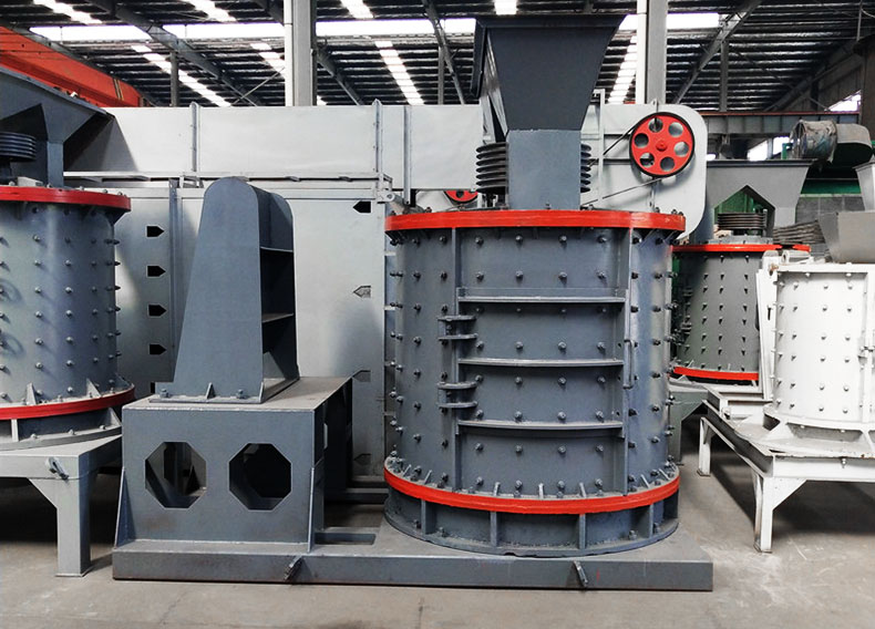 物料由機器上部垂直落入高速旋轉的葉輪內,在高速離心力的作用下,與另一部分以傘狀形式分流在葉輪四周的物料產生高速撞擊與粉碎,物料在互相撞擊后,又會在葉輪和機殼之間以物料形成渦流多次的互相撞擊、摩擦而粉碎,從下部直通排出,形成閉路多次循環(huán),由篩分設備控制達到所要求的成品粒度。