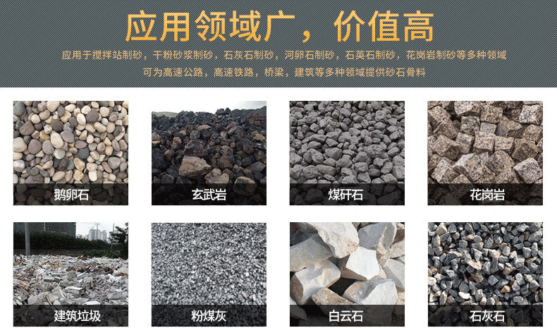 【適用物料】:石灰石、石英石、花崗巖、白云石、鐵礦石、煤矸石、河卵石、風化巖、軟巖石料等