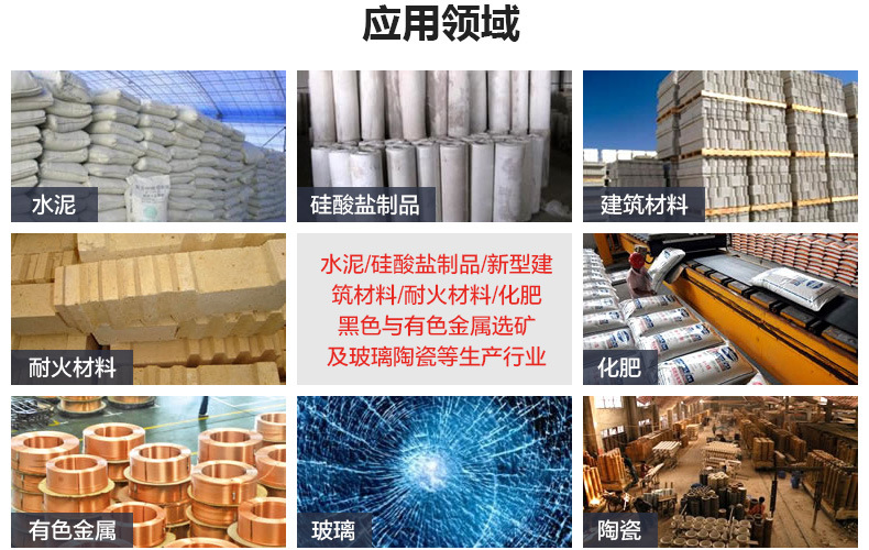 【應(yīng)用范圍】:水泥,硅酸鹽制品,新型建筑材料、耐火材料、化肥、黑色與有色金屬選礦以及玻璃陶瓷等生產(chǎn)行業(yè)。