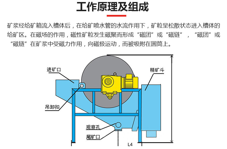 操作和檢修方便;獨(dú)特的集中潤(rùn)滑系統(tǒng),潤(rùn)滑更快捷,保養(yǎng)工作量小。礦漿經(jīng)給礦箱流入槽體后,在給礦噴水管的水流作用下,礦粒呈松散狀態(tài)進(jìn)入槽體的給礦區(qū)。在磁場(chǎng)的作用,磁性礦粒發(fā)生磁聚而形成“磁團(tuán)”或“磁鏈”,“磁團(tuán)”或“磁鏈”在礦漿中受磁力作用,向磁極運(yùn)動(dòng),而被吸附在圓筒上。